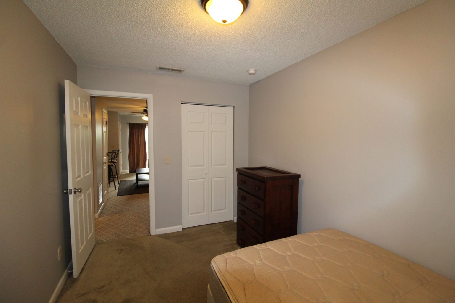 We have a 1 room in a 4 bed, 2 bath townhome available now. This townhome comes complete with a living room, wet bar, balcony, and 2 beds, and 1 bathroom on each floor. There is a nice-sized laundry room on the second floor and a kitchen off the entryway. Tenants in this unit are male and female.