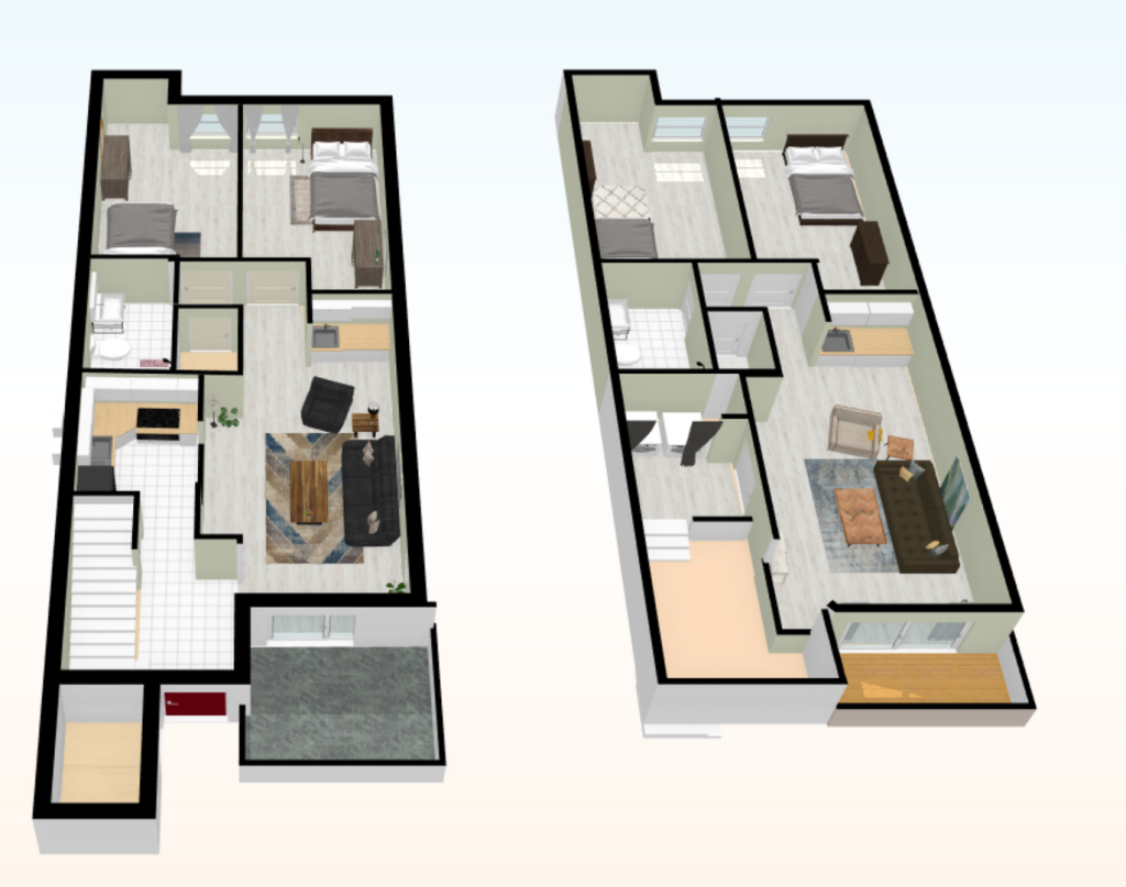 Each floor has its own living room, a balcony and a mini kitchenette, two bedrooms, and a bathroom.