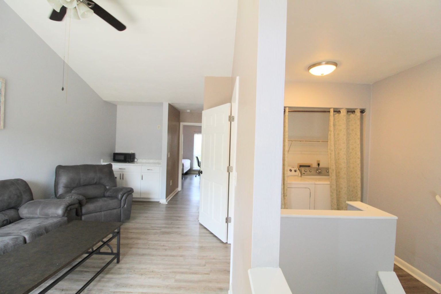 Each floor is like its own apartment, featuring a living room, mini kitchenette, 2 bedrooms, a bathroom, and even a private balcony! The large kitchen and laundry are shared, but you’ll still have plenty of space to make it your own.